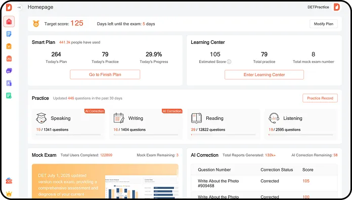 DET Practice ist die All-in-One-Plattform für Duolingo-Übungstests. Wir bieten die größte Testbank, vollständige Probeprüfungen, professionelle Korrekturservices und eine Vielzahl von KI-Tools.